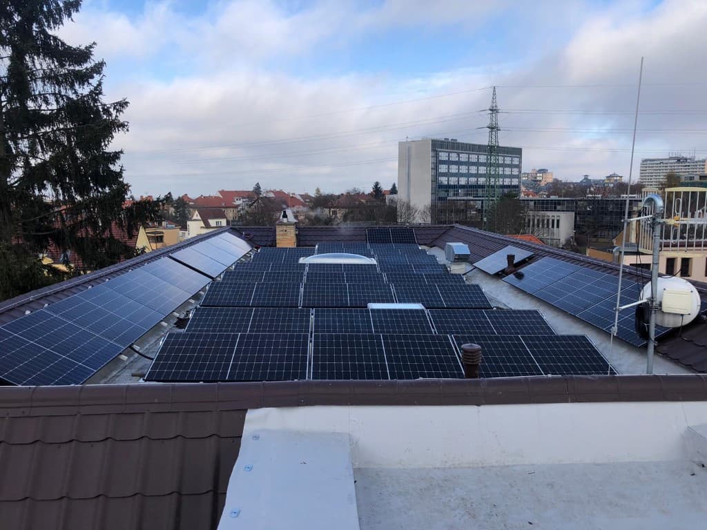 Uložení panelů se přizpůsobovalo velikosti a tvaru střechy objektu. Pro maximalizaci výkonu se využilo i postranní uložení. Pro dosažení maximálního využití slunečního osvitu jsme použili regulátory VICTRON, které dokážou zapojit malé množství panelů do série. Tím jsme vyřešili problém částečného zastínění, protože plochy, které budou dočasně ve stínu, jako např. na západ orientované panely v ranních hodinách, nebudou omezovat výrobu u panelů, které jsou plně v osvitu.