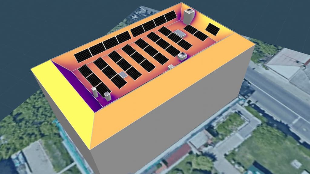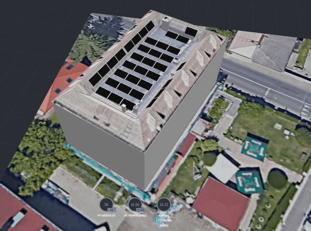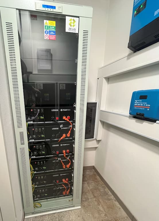 Pro maximalizaci výroby se nasimulovalo osazení střechy. Instalovalo se 16.5 kWp výkonu v panelech. Vzhledem k faktu, že ne všechny panely jsou ve stejnou dobu v plném osvitu, výsledek simulačního softwaru určil dostatečné použití střídače Victron Multiplus II 5000VA s celkovým výkonem 12 kW. Tento průmyslový střídač zabezpečuje kompletní využití vyrobené energie a zároveň v kritické situaci výpadku proudu dokáže vyrobit až 2.5 násobek svého nominálního výkonu. Systém je vybaven bateriemi o kapacitě 27.4 kWh a zajišťuje, aby provozovna se zvláštním režimem energeticky vydržela v chodu i několik hodin bez připojení k distribuční síti.